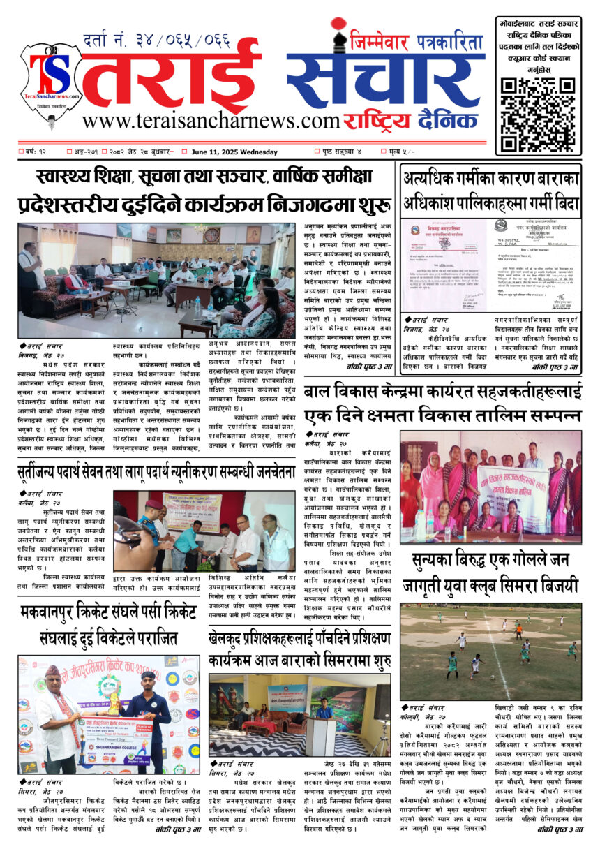 ई–पेपरहेडलाईन आज २०८२ जेष्ठ २८ गतेको तराई सञ्चार राष्ट्रिय दैनिक पढ्नु भयो ? २०८२ जेष्ठ २८ गते 349 पाठक संख्या शेयर पठन समय 0 मिनेट शेयर शेयर Facebook Copy Link Print Leave a Comment Leave a Reply Cancel replyYour email address will not be published. Required fields are marked *Comment * Name * Email * Website Save my name, email, and website in this browser for the next time I comment. ताजा अपडेट नगरस्तरीय परीक्षामा उत्कृष्ट नतिजा प्राप्त गर्ने विद्यालयका विद्यार्थी पुरस्कृत राजनीति शिक्षा हेडलाईन संसदीय समितिमा बाराका चारै सासदहरु कुन कुन समितिमा परे ? राजनीति हेडलाईन मालपोत कार्यालय कलैयामा सिडिओ मिश्रको छड्के अनुगमन तराई विशेष हेडलाईन पूर्व सदस्य सचिव युवराज लामाद्धारा नेपाली कम्युनिस्ट पार्टी परित्याग राजनीति हेडलाईन बारा जिल्लाका युवाहरूलाई सचेत रहने अपिल राजनीति समाचार हेडलाईन आज दिउँसो ४ बजे मन्त्रिपरिषद् बैठक राजनीति हेडलाईन कांग्रेस नेता एवं पूर्वमन्त्री दीपक खड्का पक्राउ अपराध राजनीति हेडलाईन Your browser does not support the video tag.