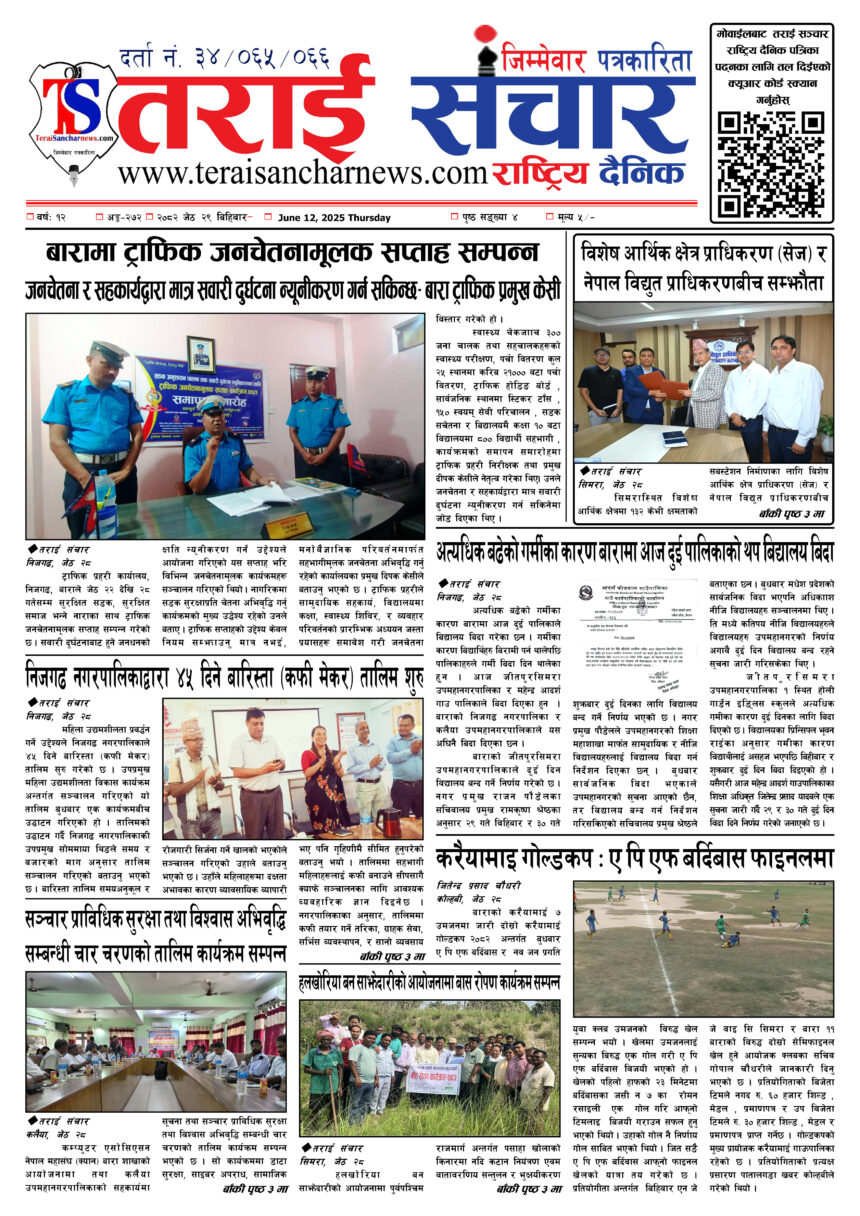 ई–पेपरहेडलाईन आज २०८२ जेष्ठ २९ गतेको तराई सञ्चार राष्ट्रिय दैनिक पढ्नु भयो ? २०८२ जेष्ठ २९ गते 309 पाठक संख्या शेयर पठन समय 0 मिनेट शेयर TAGGED:teraisanchar शेयर Facebook Copy Link Print Leave a Comment Leave a Reply Cancel replyYour email address will not be published. Required fields are marked *Comment * Name * Email * Website Save my name, email, and website in this browser for the next time I comment. ताजा अपडेट नगरस्तरीय परीक्षामा उत्कृष्ट नतिजा प्राप्त गर्ने विद्यालयका विद्यार्थी पुरस्कृत राजनीति शिक्षा हेडलाईन संसदीय समितिमा बाराका चारै सासदहरु कुन कुन समितिमा परे ? राजनीति हेडलाईन मालपोत कार्यालय कलैयामा सिडिओ मिश्रको छड्के अनुगमन तराई विशेष हेडलाईन पूर्व सदस्य सचिव युवराज लामाद्धारा नेपाली कम्युनिस्ट पार्टी परित्याग राजनीति हेडलाईन बारा जिल्लाका युवाहरूलाई सचेत रहने अपिल राजनीति समाचार हेडलाईन आज दिउँसो ४ बजे मन्त्रिपरिषद् बैठक राजनीति हेडलाईन कांग्रेस नेता एवं पूर्वमन्त्री दीपक खड्का पक्राउ अपराध राजनीति हेडलाईन Your browser does not support the video tag.