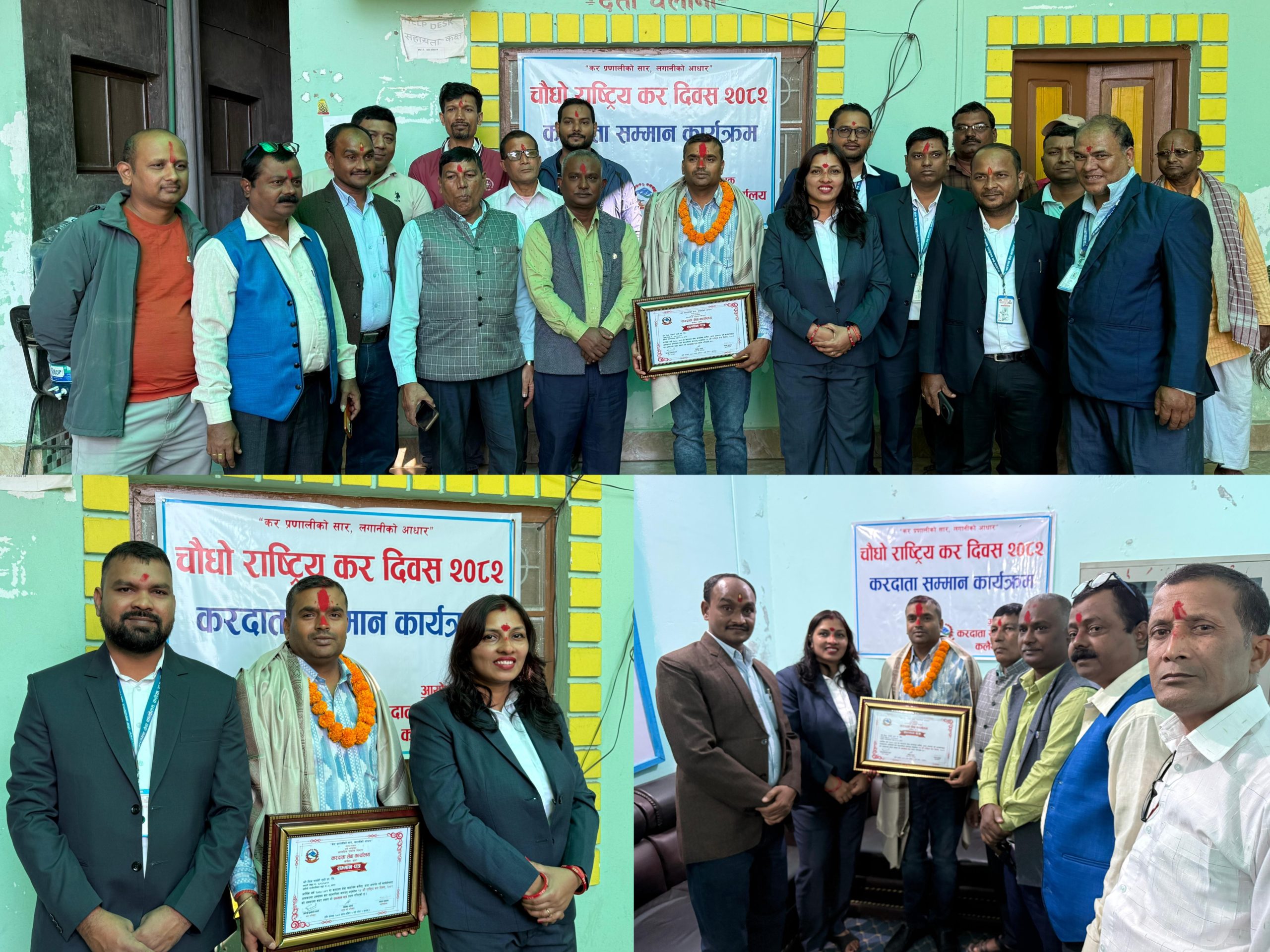 त्यसैगरी करदाता सेवा कार्यालय कलैयाले १४औँ राष्ट्रिय कर दिवस विभिन्न कार्यक्रमका साथ धुमधामपूर्वक सम्पन्न गरेको छ । करदातामा करप्रति जागरुकता अभिवृद्धि गर्ने उद्देश्यले कार्यालयले सोमबार विशेष समारोह आयोजना गर्दै दिवस मनाएको हो । कलैया ७ स्थित कार्यालय भवन हलमा भएको कार्यक्रममा करदाताहरुले कर प्रणालीलाई सरल, पारदर्शी र करदाता–मैत्री बनाउन उद्योगी ब्यापारीहरुले आग्रह गरेका छन । कार्यालय प्रमुख अन्जु कुमारी कर्णको अध्यक्षतामा कार्यक्रम सम्पन्न भएको हो । नियमित रूपमा कर तिर्ने उत्कृष्ट करदाताहरुलाई सम्मानपत्र प्रदान गर्दै कर दिवसको महत्वमाथि चर्चा गरेकि थिइन ।